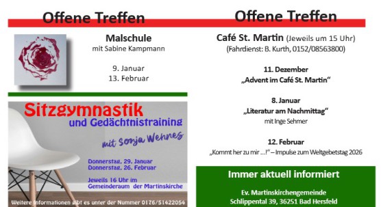 Am Donnerstag, 8. Januar, öffnet die Martinskirchengemeinde um 15 Uhr wieder ihr Café St. Martin. Die Gäste sind eingeladen, zusammen mit Inge Sehmer zum Thema „Was ich mir wünsche - Gedanken zum neuen Jahr“ ins Gespräch zu kommen. Das Café-Team im Gemeindesaal freut sich zum Start ins neue Jahr auf ein fröhliches Beisammensein bei Kaffee und Kuchen. Einen Fahrdienst bietet Bettina Kurth an: 0152/08563800.