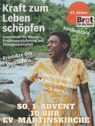 Die Ev. Martinskirchengemeinde lädt zur Eröffnung der 67. Aktion von Brot für die Welt ein. Im Gottesdienst mit dem Motto "Kraft zum Leben schöpfen" am 1. Advent um 10 Uhr stellt das Vorbereitungsteam Luisa Curuki und ihre Familie von der Fidschi-Insel Vanua Levu vor. Was bedeutet der Klimawandel für sie? Welche Projekte sichern in Zukunft ihr Leben? Diesen und anderen Fragen wird im szenischen Spiel nachgegangen. Im Anschluss ist Zeit für Begegnungen im Kirchencafé und den Erwerb von Produkten des Weltladens. Kollekte und Spenden sind für die Aktion Brot für die Welt bestimmt.