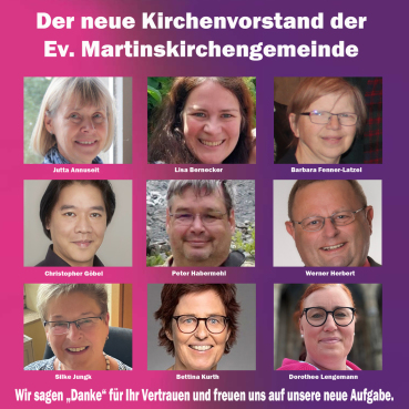Am Sonntag, 22.9.19, wurde für sechs Jahre unser Kirchenvorstand gewählt. Herzlichen Dank den Wahlhelfern und allen, die an diesem Tag im Einsatz waren. Von 1836 Wahlberechtigten in unserer Gemeinde haben 330 gewählt. Das ist eine Beteiligung von 17,9 %. Gewählt wurden Dr. Wolfgang Thon, Vera Hettenhausen, Barbara Fenner-Latzel, Jutta Annuseit, Werner Herbert, Christopher Göbel, Dorothee Lengemann und Sylvia Braun. Dazu berufen wurde Silke Jungk. Kirchenältester bleibt weiterhin Friedrich Hafermaas. Als Kirchenälteste wurde Marianne Bierschenk bestimmt.