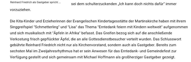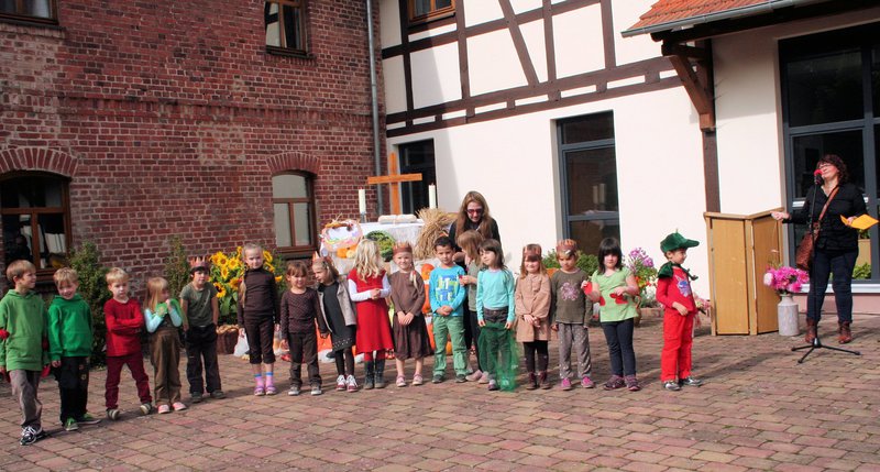 Reich bestückt ist zurzeit der Gabentisch der Natur. Was über den Sommer gewachsen ist, kann nun im Herbst geerntet werden. Um Gott für diese Gaben aus Äckern und Gärten zu danken, feiern am kommenden Wochenende viele Menschen das Ernte-Dank-Fest. Die Gemeinde der evangelischen Martinskirche hat den Reigen der Feiern am vergangenen Sonntag mit einem Gottesdienst auf dem Hof Meisebach begonnen. Die herbstlich-warmen Sonnenstrahlen ermunterten viele Besucher zum Kommen, sodass der Innenhof übervoll war. Mit zahlreichen Früchten der Erde war ein Altar aufgebaut und dekoriert worden. Seine bunte Pracht bot einen schönen Anblick. Der Gottesdienst von Pfarrer Karl-Heinz Barthelmes wurde von den Kindern der evangelischen Kindertagesstätte mitgestaltet. Sie führten das Tanzlied vom Apfelbaum und dem Igel Paul auf und sangen mit den Besuchern "Seht, was wir geerntet haben". Musikalisch wurde der Gottesdienst von den Saxophonics Jonas Englich, Christian und Andreas Winter sowie Marcel Schmidt umrahmt, was bei den Besuchern sehr gut ankam. Ein engagiertes Helferteam hatte das sich dem Gottesdienst anschließende Gemeindefest organisiert. Ein üppiges Kuchenbüfett stand für die Besucher bereit. In dem schönen Hof-Ambiente wurde noch lange beisammengestanden und -gesessen.